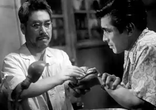 Due sono i protagonisti. Sanada (Takashi Shimura) è Il dottore, l’angelo ubriaco. Matsunaga (un giovane Toshiro Mifune, qui al suo esordio) è il malvivente. Intorno a loro, un piccolo villaggio povero e lercio ( simbolo di un Giappone devastato dal dopoguerra) circondato da una fogna a cielo aperto dispensatrice di tubercolosi.