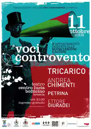 "Voci Controvento" è un evento sulla nuova canzone d'autore, quest'anno ha visto avvicendarsi sul palco 4 ospiti: in ordine d'ingresso sul palco Ettore Giuradei, Debora Petrina, Andrea Chimenti e Tricarico. In questo caso parlerò separatamente dei concerti singoli e poi eseguirò un bilancio complessivo: