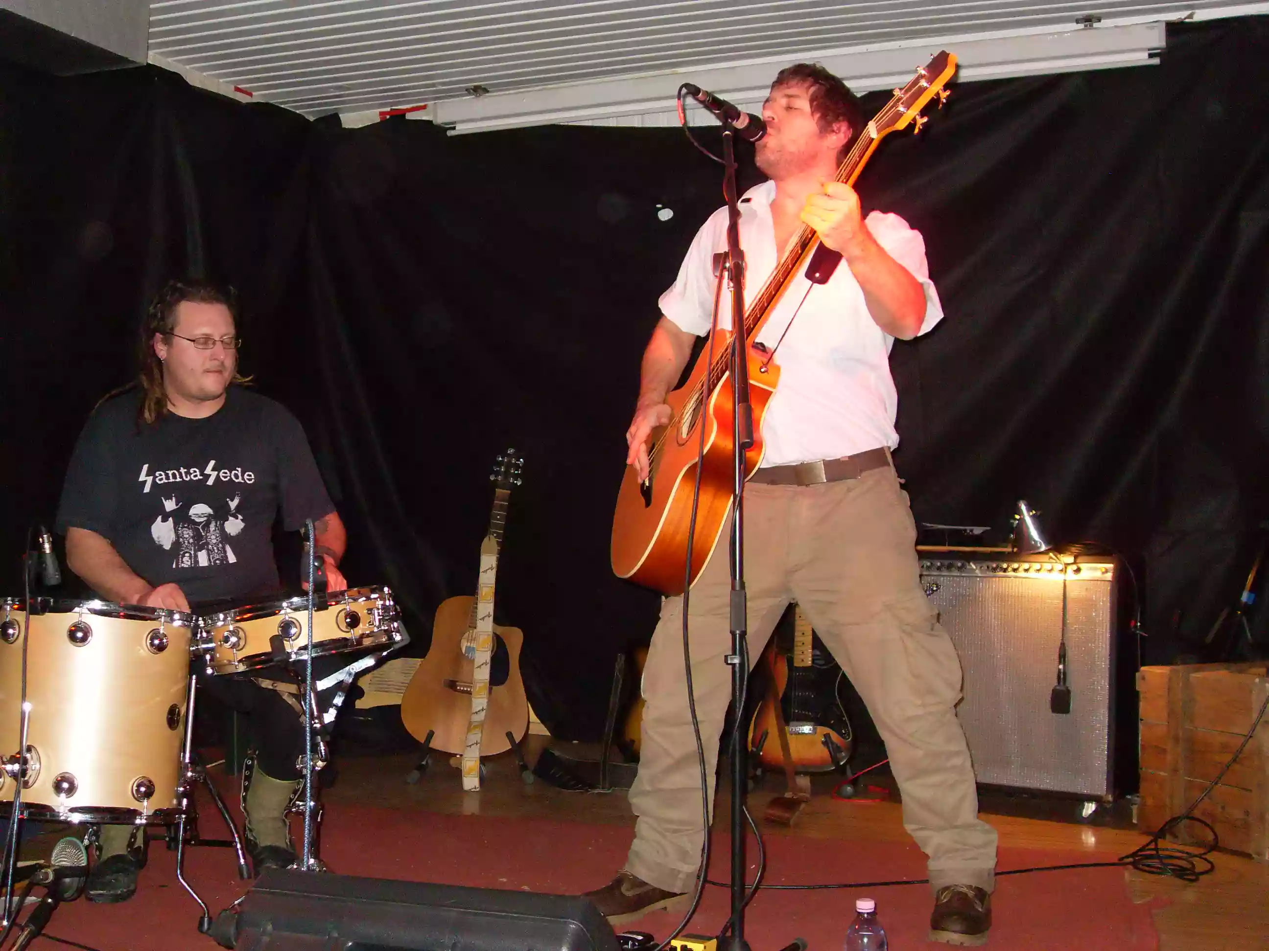 Passiamo al concerto e partiamo dalla location: posto piccolino ma fortuna vuole che ci sono dei divanetti nei pressi del palco e quindi il sottoscritto si abbandona a madama Pigrizia, restando naturalmente con una visuale ottimale; doppio è il vantaggio: vedo comodo il concerto e non ho problemi di visuale! (manco fossi a casa mia). Sul palco una batteria ridotta all'osso (piatto, timpano, rullante) e, in fondo al palco, basso acustico, due chitarre elettriche e una acustica. Dettaglio che incuriosisce. Si parte alle 23:15 circa, l'ingresso sul palco è particolare: Dorella guarda il pubblico e non sembra contento (saranno state a far tanto 70 persone) e invita ad avvicinarsi. Nulla da fare. Tanto vale partire. Principalmente in scaletta i pezzi del disco nuovo che dominano la prima parte di concerto. Piano piano il mio udito si apre al sound del gruppo con forte interesse, ascoltandoli sembrano che batteria e chitarra si muovano su binari paralleli eppure non lo sono, arrivando ad unirsi sempre nel momento migliore. Strade diverse, obiettivo medesimo: elemento forte e gradevole. Il modo di suonare non è "canonico", gli strumenti sono pizzicati, manipolati ed arricchiti di un qualcosa che non sembra visibile, ti sorprendi che sul palco ci siano solo due strumentisti. La batteria è più ricca di quanto le parti usate non dimostrino; con la chitarra le corde assumono un ruolo meno dominante, i tocchi sono eleganti e rarefatti, e si accompagna un ritmo sincopato. Qualcosa di tribale ed assolutamente inebriante, lo capisci con pezzi di notevole intensità come "Lui Verrà", "Mestiere che Paghi per Fare" e "Tarlo della Sete". Sì può parlare di qualcosa che trascina, risultando oscuro e perfino mistico.