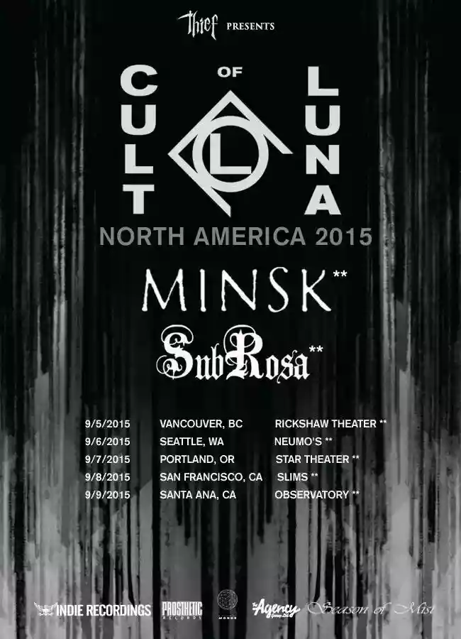 Los Angeles stanotte è stata destrutturata. Spogliata di ogni inerme costruzione e poi pian, piano riassemblata dagli artefici della stessa onda distruttrice. Una rovente serata che inizia intorno alle 19:00 quando sul Roxy Theatre di West Hollywood salgono sul palco i SubRosa, formazione dello Utah che con i suoi flebili sussurri di voci femminili riescono a connotare spettralmente l'incipt di una nottata che diventerà un tortuoso e perpetuo trip atmosferico. I violini salgono più volte alla ribalta nel magma viscoso di riff dal sapore doom che rallentano e rendono l'aria rarefatta. La risposta del pubblico è più che positiva, addirittura la mia amica mi rivela di esser lì proprio per loro. Le melodie sono più volte macchiate da una voce che si trasforma lentamente da soffusa a vigorosa, decisa ad imbrigliare le rovinose macerie che man, mano si creano a causa dell'incessante martellare della batteria. I SubRosa son un tramonto che al calare regala spazio al cielo stellato, ma non son ancora capaci di liberare l'apocalittico scenario che da lì a poco si sarebbe scaraventato con un impeto fuori controllo. Non c'è neanche il tempo di due chiacchiere e di parlare del prossimo live di Chelsea Wolfe che il vortice iracondo di sludge e post metal si sta per abbattere di nuovo su di noi. Come una tempesta acida che cade copiosamente da un cielo densissimo arrivano i Minsk. La forza dell'urto provocato è immensa. Quei bagliori di scenari crepuscolari e folk dei SubRosa vengono spazzati via letteralmente da un wall of sound che fagogita senza distinzioni prima il growl annichilente e poi ingloba nel suo ventre le suite strumentali. Un alternarsi d'arpeggi che aprono a liquidi e dilatati scenari e a cambi di rotta in cui ci si può perdere in un millisecondo, vista l'imprevidibilità folle. Quando i Minsk imboccano la via più terremotante il sound si impregna di ferocia e furia cieca. Si creano delle vere e proprie cavalcate che non concedono seconde chance, lasciando impietriti ed esterefatti chi ancora si cullava nella malinconia dei SubRosa. Il liet motiv della serata è stato innestato. Se i SubRosa avevano forgiato uno scorcio drammatico, ma carico di pathos, i Minsk prendono quell'emozionalità decomponendola in spazi al servizio del più viscerale post metal. Quando la loro performance finisce, non c'è più alcun paesaggio rincuorante. C'è solo della polvere sulla quale si dovranno ergere come dei monoliti i protagonisti della serata: i Cult of Luna. Ora, è stato bello raccontarvi questo concerto, ma finisce qua, perché quello che seguirà nella quasi ora e mezza di performance è indescrivibile, però, insomma, arrivati fino a questo punto è dovere svelarvi tutto.