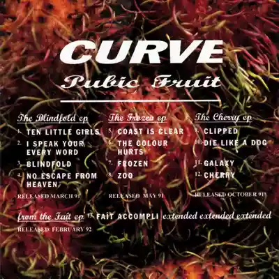 "Pubic Fruit" ovvero l'unione dei primi tre LP dei Curve, la band/duo formata da Dean Garcia e Tony Halliday. Reduci dal successo ottenuto con il loro primo lavoro "Doppelgänger" nello stesso anno, il '92, esce quest'album - compilation contenente le loro prime sperimentazioni del '91 che permisero al duo di poter proseguire nella loro (breve) carriera. Si parte con "The Blindofld EP" ed è già una vera sorpresa entrare in contatto con quattro tracce musicali così diverse da loro, spaziando dal rock, al grunge, all'elettronica, i bassi potenti (a volte fastidiosi); e così tra una composizione e un'altra risuona il ricordo e la volontà di continuare l'ondata dream-pop alternativa molto in voga in quel tempo, contaminata con qualche ritornello rap ("Ten Little Girls"), a volte rock ("I Speak Your Every Word"), il parlato a tratti impercettibile ("Blindfold", a mio avviso una delle migliori tracce), l'elettronica ("No Escape From Heaven").