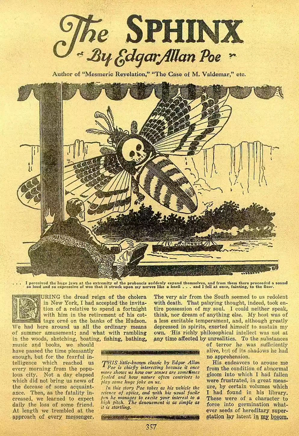 Questo racconto breve del 1846 contiene tutti gl’ingredienti del maestro del terrore letterario. The Sphinx è un viaggio sospeso tra materialità e presagio, tra parvenza e tangibilità; è un incubo che scava nei più remoti nembi della mente, varcando la scheggia più inviolabile della soggezione umana. Ha come protagonisti due individui costretti a rifugiarsi in un cottage sulle rive dell’Hudson, per non essere contagiati da una violenta epidemia di colera scagliatasi su New York. Ma il vero pretesto narrativo è un altro: una nefasta comparsa, una mostruosa anomalia che sembra discendere una collina dirupata visibile all’orizzonte, oltre il vetro di una delle finestre del cottage. La narrazione dei due protagonisti che argomentano sull’accaduto, non fa altro che palesare il genio di Poe, il quale si serve dei due personaggi per personificarne le rispettive reazioni umane: da una parte il disturbante effetto causato da una scioccante apparizione, dall’altra una sobria cautela governata dalla ragionevolezza e dallo scetticismo. A tale proposito, quando il lettore chiuderà il libro, sorridente e pensoso dopo aver letto l’ultima riga, la domanda che si porrà sarà la seguente: “A quale reazione umana appartengo? A quale dei due protagonisti assomiglio di più?”