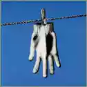 Un guanto da bambini bianco appeso ad un filo ad asciugare, sfondo blu ciano e pallido...