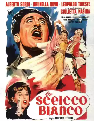 Lo Sceicco Bianco narra la storia di due sposini meridionali in viaggio di nozze a Roma. Lui, Ivan Cavalli (il grande Leopoldo Trieste) è un giovanotto italico all’antica (del resto siamo nel 1952) baffetti d’ordinanza, sguardo fisso e fiero, gelosissimo, religiosissimo (per convenienza, chi vedrà capirà). Lei (una giovanissima e graziosissima Brunella Bovo) è l’ingenua, dolce, innocente, casta e pura Wanda Giardino (in Cavalli of course).