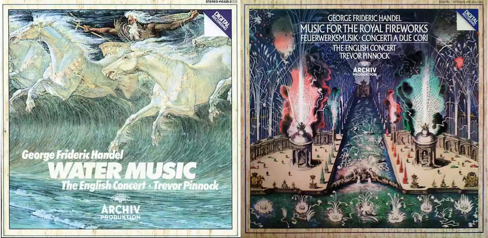 Le due opere che prendo in esame sono state scritte dal compositore barocco Georg Friedrich Händel per essere eseguite all'aria aperta. Il Maestro compose la "Water Music" per una festa che si svolgeva sul Tamigi nel 1717 (da qui il nome di "Musica sull'acqua"), l'orchestra era posta su una barca che seguiva l'imbarcazione reale (queste gite musicali sul fiume vennero fatte più volte nel corso degli anni). Mentre la "Music for the Royal Fireworks" fu composta nel 1749, per festeggiare la conclusioni della guerra di successione (austriaca/inglese chiaramente a favore di questi ultimi). L'orchestra, in questo caso era posta nel parco di Londra, in cui era stata appositamente costruita una sontuosa facciata in legno di un castello, durante la serata ci furono spettacoli di fuochi d'artificio (ecco il perché del titolo di questa seconda opera) .