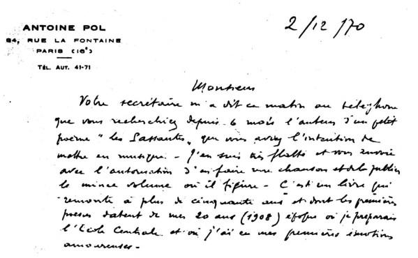 Ma finalmente e per caso squillò il telefono di un cantautore ormai coi baffi grigi. All’altro capo del filo un intermediario per l'ormai anziano poeta. I due si scrissero, ma non riuscirono mai ad incontrarsi. Una lettera, datata 2 dicembre '70. Lo sconosciuto Antoine morì poco dopo, prima di riuscire ad ascoltare, dalla voce di Brassens, questa semplicissima e vibrante canzone, amara e colma di rimpianti come la vita.
