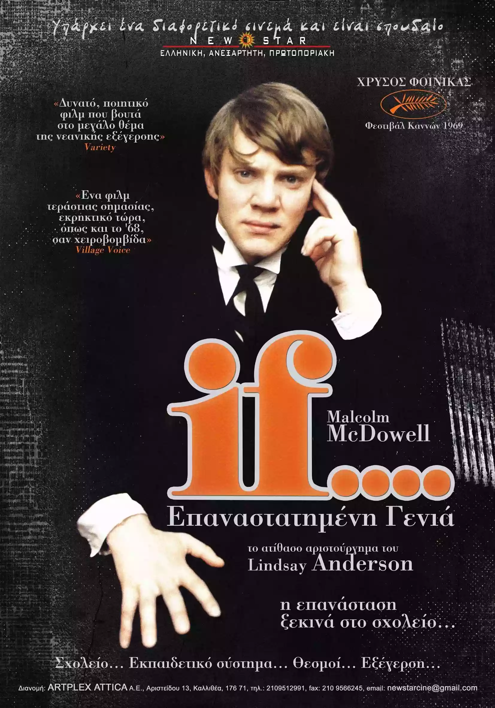 Usualmente, almeno in Italia, l'attore inglese Malcom McDowell viene associato al personaggio di Alex DeLarge protagonista di "Arancia meccanica". Ma facendo così non si rende giustizia a McDowell , poiché si dimentica il suo esordio (e che debutto!) nel film "If..." diretto da Lindsay Anderson nel 1968 e premiato con la Palma d'oro al festival di Cannes nel 1969. Un film che merita di essere rivisto e che desta meritatamente l'attenzione dello spettatore, con la stessa forza di un sasso tirato in piccionaia contro certo perbenismo ipocrita anglosassone.