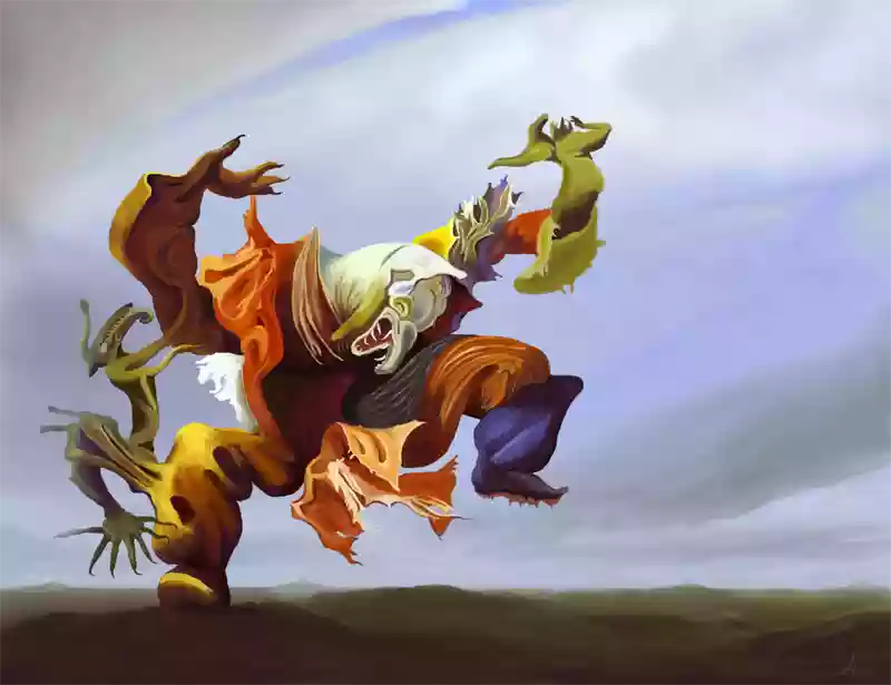 Queste sono le uniche informazioni che io ho reperito su Internet riguardo questa sconosciuta opera di uno dei più grandi pittori surrealisti di sempre, Max Ernst. Difficile davvero analizzare questi quadri, difficilissimo quando devi cercare di estrapolare qualcosa senza alcun aiuto. Cominciamo dal titolo: tradotto dal francese significa: "L'angelo della casa o il trionfo del Surrealismo". La seconda parte del titolo direi che è abbastanza azzeccata, vista da natura del dipinto: uno strano abominio antropomorfo multicolore, con un'inquietante protuberanza sulla gamba destra e attaccata al braccio destra, e con una testa di un animale non meglio identificato (cane? Cavallo? Aquila? tutti e tre mischiati? Ognuno può dire la sua). Inoltre sorge un'altra domanda: cosa fa? Perché sta ballando in quella landa deserta e brulla? Osservata anche la testa: sta piangendo o sta ridendo?