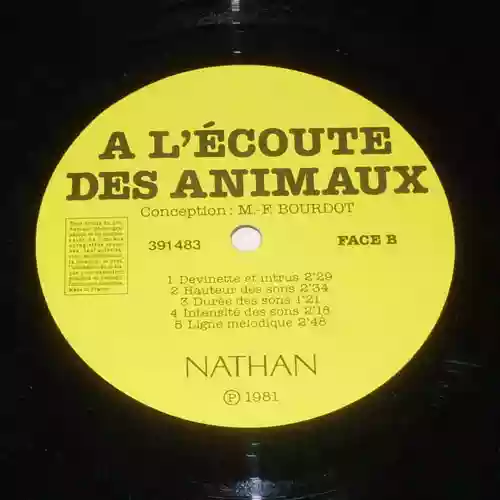 Ed eccolo qua, buttato nell’inevitabile angolo delle porcherie, in una busta interna ingiallita, senza copertina esterna e senza libro allegato (informazione necessariamente pescata dall’internet), questo LP intitolato “A L’écoute des Animaux”. Cosa mi ha spinto a comprarlo? Il mio debole per Vangelis, e la mia mente malata che ha associato questo titolo al ben più noto “L'apocalypse des Animaux”. Si insomma, speravo di trovare un Vangelis francese di serie B. Le sporadiche note ci informano che il disco è stato prodotto dalla Nathan di Parigi, anno 1981, per concezione di un certo M.F. Bourdot. Cosa ci raccontano questi solchi? Beh, un’emerita cippa, dal momento che si tratta di una sequenza, solo apparentemente casuale, di versi di animali, dalle api ai cavalli, dai maiali alle pecore, e poi leoni, zebre, elefanti, giraffe, rane, coleotteri e così via fino alla fine del disco. Tra un verso e l’altro un intermezzo di circa cinque secondi. Colto da un sorriso inebetito, sospeso tra l'incazzo e la soddisfazione, ho quasi gridato al miracolo. Perché “quasi”? Perché trattasi palesemente di un disco per bambini, a scopo per lo più educativo e propedeutico. Emblematici sono i titoli del disco, dove ogni traccia invita il bambino ad un esercizio diverso, tra i quali: identificazione dei versi, riconoscimento del verso intruso, individuazione dell’ambientazione e così via. Insomma, alla fin fine un disco utile per allenare l’orecchio dei vostri figli ed incentivare il ragionamento. E’ un vero peccato, perché se fosse stata una produzione per adulti, l’avrei collocata probabilmente tra i capolavori del trash.