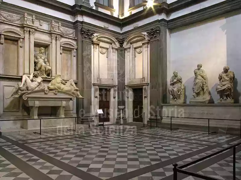 Il problema della relazione tra l'architettura della cappella e la scultura dei monumenti funerari in casa Medici venne risolto da Michelangelo con la disposizione di questi ultimi a parete, incassandoli nei comparti centrali delimitati dalle paraste in pietra dell'ordine inferiore. L'adozione, per contrasto del marmo bianco nelle membrature architettoniche delle tombe restituì autonomia a questo sistema privandolo di qualsiasi ruolo strutturale, coerentemente con la tradizione del monumento funerario a parete. Le tombe di Lorenzo il Magnifico e di suo fratello Giuliano, purtroppo, non furono mai eseguite, mentre le sepolture dei duchi di Giuliano di Nemours e Lorenzo di Urbino, furono collocate lungo le pareti laterali della cappella- Le statue, che rappresentano i due esponenti della famiglia Medici precocemente scomparsi si fronteggiano in posizione elevata, in due nicchie incassate nella zona centrale di ciascun monumento. Si tratta di effigi idealizzate non di veri e propri ritratti. I duchi vengono, infatti, presentati in vesti di capitani militari con antiche armature e senza barba. Il trionfo della famiglia Medici sul Tempo, e per lei dei due membri effigiati, è rappresentato dalle allegorie delle quattro parti del giorno (Aurora, Giorno, Crepuscolo, Notte) adagiate a coppie sui sarcofaghi isolati davanti a ciascun monumento.