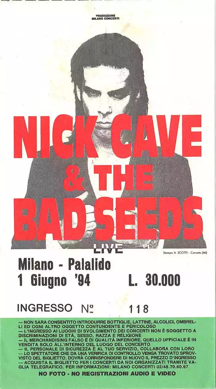 Allora era il Giugno del 1994 ed il concerto si tenne in un caldissimo Palalido a Milano; biglietti acquistati con largo anticipo ed ancora conservati con la massima cura. Ci andai insieme a Marina. Giungemmo davanti al palazzetto milanese come sempre in largo anticipo rispetto all'orario di apertura; caldo già atroce anche se era soltanto il primo giorno del mese di Giugno. Da poco Nick ed i Semi Cattivi avevano pubblicato "Let Love In", disco tra i loro migliori degli anni novanta.