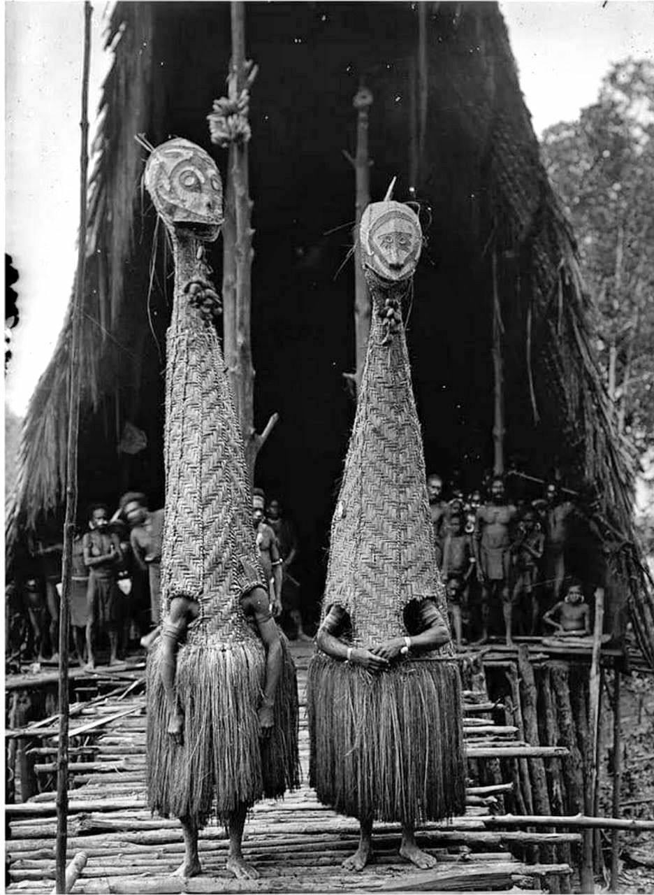 Танцоры в костюмах перед мужским домом в деревне Товей, Папуа-Новая Гвинея, 1921