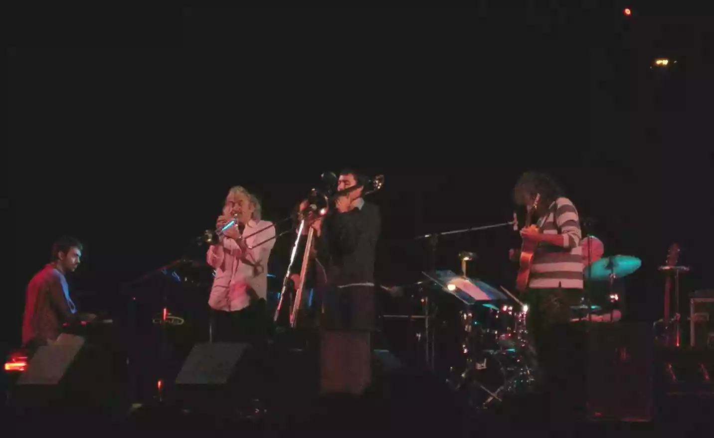 Pochi convenevoli, molti sorrisi e si parte con la musica, alla grande già dall'inizio. Non hanno bisogno di scaldarsi, sono già roventi. I due brani di Enrico Rava, che aprono la serata, vengono iperdilatati fra ripetuti assolo, duetti e trii, che nella frenesia dei suoni marcati e accesi mettono subito in evidenza l'impronta caratteristica di tutto il concerto: la grandissima personalità di tutti i musicisti, che suonano alla pari. Sul palco in realtà non c'è una stella, ma ce ne sono sei e questo sorprende ancor di più se si pensa - ad esempio - che il trombonista è davvero giovanissimo (classe 1975). Ma Gianluca Petrella dimostra di non avere alcuna sudditanza, perché è un vero istrione capace di lanciarsi di continuo nelle jam sessions, alternando la ricerca di note alte a quelle grevi. Straordinario, un musicista da tenere sott'occhio. Enrico Rava ... che dire. Un vero signore: poche parole, sguardo ironico, tanta musica e la capacità di fare cose semplici senza farsi prendere la mano, rimanendo sempre misurato e caldo, sia nei momenti meditativi, che in quelli più esuberanti. Forse ci sono trombettisti migliori, è vero, ma sinceramente non c'è un suo concerto al quale abbia assistito di cui mi sia pentito. Poi si sa che Roberto Gatto è miglior batterista jazz italiano, un musicista di spessore internazionale, che non perde mai un colpo mostrando quasi sempre quel sorriso che ti fa capire la sua gioia nel suonare. In breve, di certo non è uno che timbra il cartellino e si intende a meraviglia con tutti riuscendo ad essere il motore della serata: una garanzia. Rosario Bonaccorso, invece, accompagna i suoi assolo con la voce. Canta, dunque, e fa cantare il contrabbasso. Non l'avevo mai sentito, ma mi ha proprio sorpreso la sua vitalità, oltre la raffinatezza delle sue esecuzioni e la timbrica dei suoni che è capace di generare. Andrea Pozza, d'altra parte, elabora al piano geometrie ricche, supporta intelligentemente lo sviluppo dei fiati, dà sempre un segno importante e significativo della sua presenza nel gruppo con linee melodiche espressive, progressioni attente ed efficaci. Musicista intelligente, fantasioso e talentuoso, per di più anch'egli giovane e da osservare con attenzione. Pat Metheny, invece, lo conosciamo bene un po' tutti, ma ascoltarlo dal vivo è davvero un'altra esperienza: è semplicemente un prodigio. Con la chitarra fa quel che vuole, dando sempre l'impressione che sia la cosa più semplice di questo mondo. Sono, ad esempio, pazzesche le esecuzioni che fa in sincrono ora con Rava, ora con Petrella, ora tutti e tre insieme alla velocità della luce.