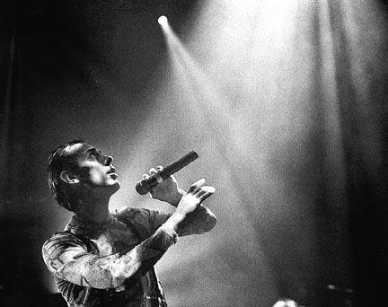 I Lia Fail, il gruppo spalla, stanno suonando nel disinteresse generale. La cantante-tastierista è brava, voce limpida e vibrante, il batterista ha la faccia simpatica, dettaglio in realtà poco rilevante dal punto di vista musicale, per il resto l’insieme è scarso e le canzoni sono più o meno tutte uguali. Un tizio vicino a te interamente vestito in latex (più tardi è previsto uno spettacolino bondage nel privé, hai saputo) schiuma, “ma quando cazzo finiscono ‘ste piaghe?”, tre ragazzucce incorpettate&calzearretate si girano e lo guardano malissimo, potrebbe anche scoppiare una rissa ma per fortuna i Lia Fail ringraziano e se ne vanno; il palco viene risistemato, le luci si abbassano di nuovo e finalmente ha inizio l’Evento.