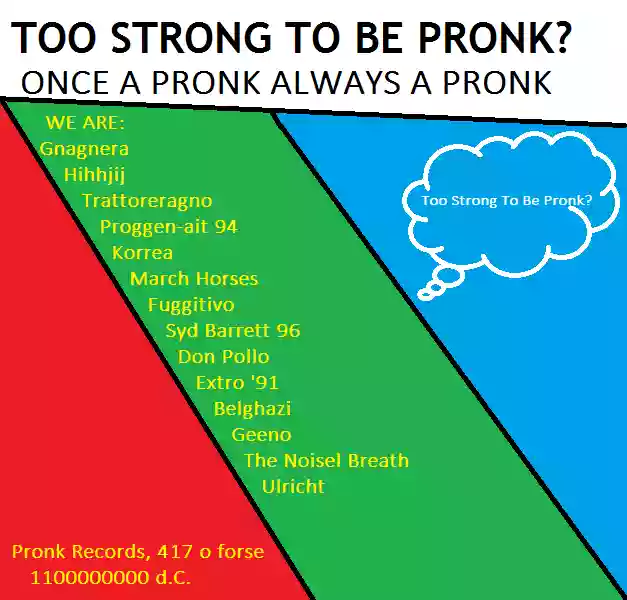 Certo che è stato un evento clamoroso la nascita del Pronk questa settimana (ma anche 6000 anni fa e anche nel 3699 a.C.). Ma cos'è il Pronk? Beh, nato come progetto progressive-punk, ben presto (forse anche prima) si è tramutato in un tutto-niente, un qualcosa di quasi mistico, non lo vedi ma effetti che provoca bastano eccome per provare la sua esistenza. E' bene sottolineare come tutti gli artisti normali considerati (più o meno a ragione) geniali ereditino, chi più, chi ancor di più, tratti distintivi del Pronk, pur non riuscendo, ovviamente, ad essere così magnificamente Pronk. Come disse qualcuno, d'altronde, Il Pronk ha 1 artista migliore (i TSTBP) e tutti gli altri sono i peggiori. Tra i gruppi maggiormente influenzati, dicevamo, si possono citare Gong, Velvet Underground, Peter Hammil, Soft Machine, Ramones e, più di tutti, Frank Zappa).