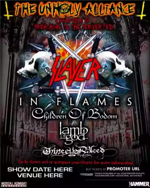 L'Inferno stà per scendere su di noi: viene sbaraccato tutto per far posto al piano rialzato dove troneggia la batteria, ai cui lati si stagliano minacciose casse Marshall impilate a forma di croce rovesciata (ogni commento è superfluo), mentre dietro verranno trasmesse immagini di caos e disperazione ad accompagnare i Maestri, gli Slayer!. Ecco, si sente l'intro pseudo-industrial di “God hates us all”, il palco è stretto dalla morsa del fumo infernale (leggasi “non si vede più una mazza” ) e in mezzo tetre figure oscure si materializzano per esordire con “Disciple”. Alè, ci risiamo: ma chi cavolo hanno messo al banco del mixer ?!? Ma non si rende conto che le chitarre sembrano lavatrici e una delle due si sente meno ?!? No, non si rende conto, visto che così iniziano e così finiranno, con suoni pessimi. Il loro show è, come dire.... il classico show Slayer, sai già quando Kerry si sposterà da Jeff e viceversa, Tom (in versione sempre più Babbo Natale) presenta i pezzi con le stesse battute usate anche nel dvd “War at the Warfield”, le croci rovesciate si sprecano, gli effetti di luce e di fumo sono troppo, troppo invadenti, i pezzi sono suonati bene ma neanche troppo (non capisco se sono troppo forti le distorsioni o loro non riescono a stoppare la corda come si deve, mah...), ma alla folla non gliene frega niente di tutto ciò: un mare in tempesta mi fa pensare che forse il posto in prima fila non sarebbe stata una buona idea. Momenti da ricordare sono quando Tom prende uno degli striscioni dei fan e lo appende sotto la batteria, ringraziando (un gesto davvero bello) e quando chiede al pubblico se vuole una canzone “di ammore” per introdurre “Dead Skin Mask”.